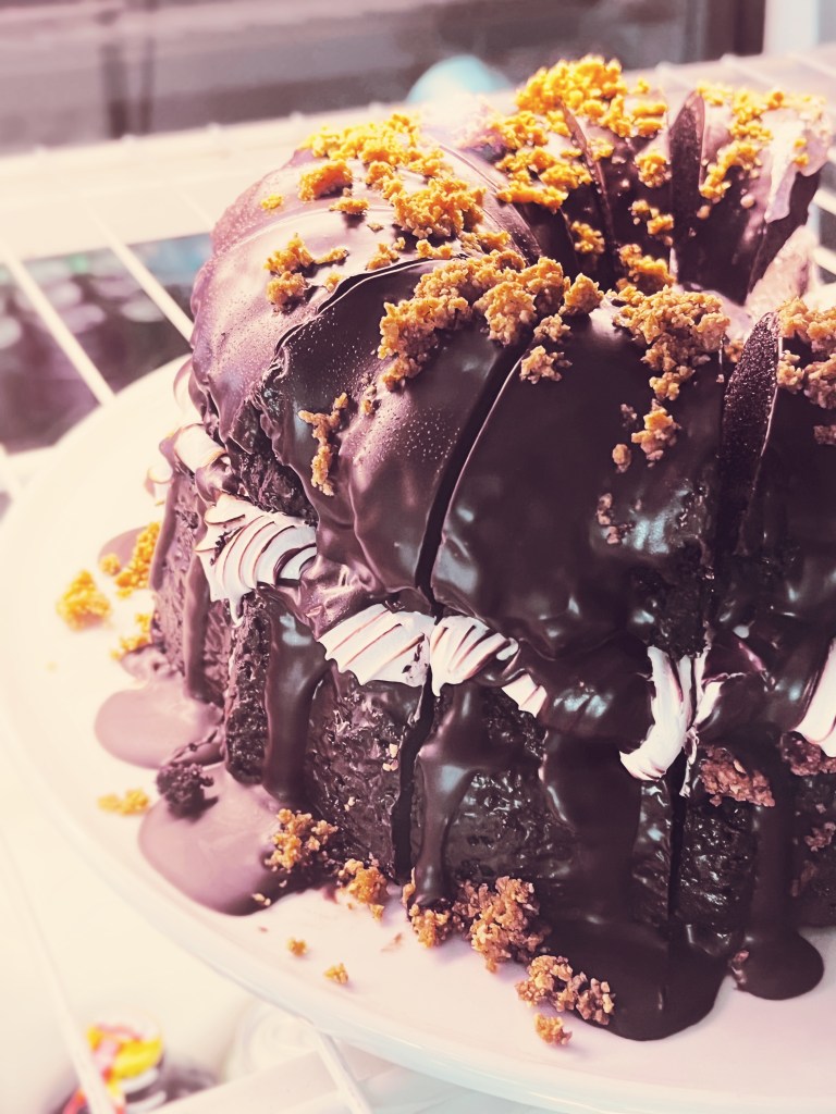 Eigentlich keine große Sache – aber heute gerät der Bagel zur Probe, denn in der Vitrine vor uns ruht das Teig gewordene Äquivalent der Sirenen von Orpheus und Odysseus: Saftig glänzender Schokoladenkuchen mit „Dickmann´s“ Füllung, flüssigem Karamell, Schokoüberzug und Butter-Crumble. Grundgütiger – DAS nenn ich mal Food-Porn! Bevor jedoch einer von uns der Versuchung erliegen kann suchen wir schnell mit unserem Bagel das Weite.