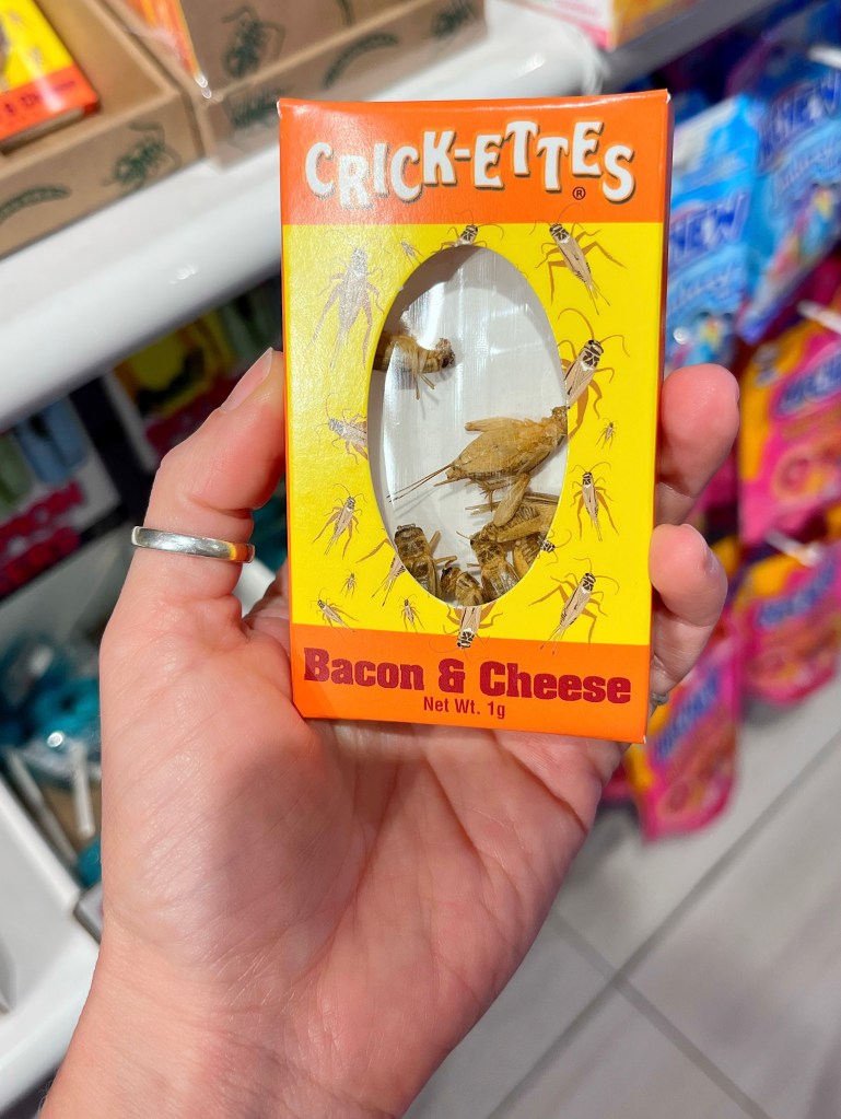 Hier, auf der alten „Cannery Row“ gibt es absolut Alles – und davon jede Menge und in allen Farben. Museen, Restaurants, Surfshops, Souvenierläden, aufwendig gestaltete Arcade-Spielhallen und viele sehr bunte Candyshops. In deren Auslagen tummelt sich alles, was schon allein vom Hinsehen einen Hauch von Zahnschmerz auf die Kauleiste zaubert. Jedoch fallen uns 2 Dinge besonders ins Auge: Mit dunkler Schokolade überzogener Bacon und (Ich kann es immernoch nicht fassen): Geröstete Heuschrecken….?! Zur Auswahl stehen die Geschmacksvarianten „Sour Cream“ oder „Bacon & Cheese“ … Ganz kurz bin ich versucht, ein Paket mitzunehmen – aber am Ende überwiegt der Ekel…. *brrrr*