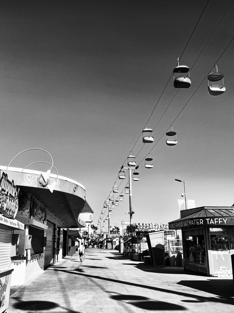 Sogar der Broadwalk, der bekannte Freizeitpark mit seinen Achterbahnen gleich an der Strandpromenade, hat geschlossen. Auf unserem Weg zum Pier passieren wir ausgestorbene Zuckerwattebuden, Loopings ohne Wagen und quietschend im Wind schaukelnde Sessel hoch oben an einem Drahtseil. Trotz aller Sonne: Ich bekomme eine Gänsehaut angesichts dieses gespentischen Ortes. Ein echter Lost Place … zumindest unter der Woche. Glaubt man den Plakaten, dann soll es am Wochenende hier immer noch rund gehen.