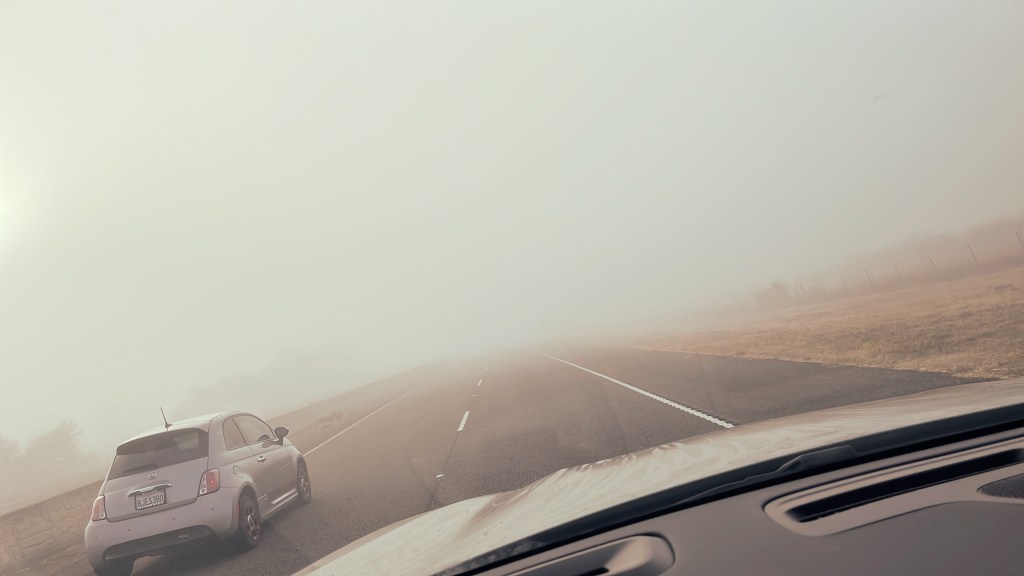 Kaum hab ich das Ortsschild von Cambria passiert, schieben sich dicke weiße Nebelschwaden vor meine Frontscheibe. Da neben dem Fahrwerk auch die Bremsen in diesem Ding hier eher zu wünschen übrig lassen, muss ich die Geschwindigkeit massiv drosseln. DAs ist der Reisezeit wenig förderlich, aber es hilft nichts. Andere Verkehrsteilnehmer oder etwaige Hindernisse kann man erst gute 20 Meter vor dem Kühlergrill ausmachen. Da ist aufpassen angesagt. Doch ein paar Minuten und ein paar Höhenmeter später lichtet sich der Nebel schon wieder genauso plötzlich, wie er gekommen ist. Über mir glänz blauer Himmel und eine noch etwas verschlafen dreinblickende Sonne.