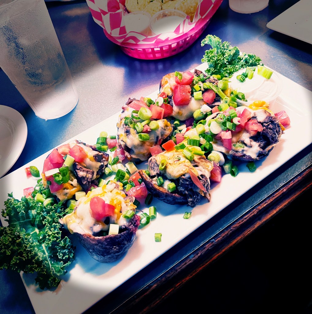Als mein Hauptgericht (= Vorspeise, wir erinnern uns!) an den Tisch getragen wird, bin ich froh, mir nichts „Richtiges“ ausgesucht zu haben. Auf meinem Teller liegen 6 halbe große Kartoffeln, halbwegs ausgelöffelt, der Hohlraum aber mit – grob geschätzt 6 Fäusten voll – Pulled Brisket aufgefüllt. Natürlich alles mit Käse überbacken, dazu Tomaten und ein Pott Sourcreme. Ist das geil! Ich kann wie üblich nur einen kleinen Teil davon vertilgen bevor ich mich satt und zufrieden ins Polster zurücksinken lasse, aber so hab ich gleich noch mein Mittagessen für Morgen mit abgehandelt. Doggy Bag sei Dank. (In dem verschwinden auch noch einige von den sauren Gurken…)