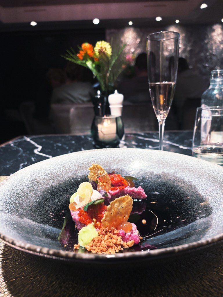 Derlei beflügelt putze ich mich anschließend angemessen für Drinks & Dinner im ausnehmend schönen Ambiente des Hotels heraus. In weiser Voraussicht hatte ich daheim sogar ein paar hohe Hacken eingepackt, die jetzt freudig raus aus dem Regal und ran an die Füße gezogen werden. Das Hoteleigene Restaurant hat bereits vor Jahren eine Michelin Empfehlung bekommen – Die Spezialität des Hauses: Fleisch. Präzise: Steaks. Dementsprechend groß ist meine Vorfreude. Doch schön alles der Reihe nach…! Erstmal warmlaufen. Und wie könnte das besser gehen als bei einem Gläschen Rosé-Champagner an der Bar..?! Genau – Gar nicht! Also sprudelt nur einen Wimpernschlag später das feinperlende Gesöff vor meiner Nase. Unglücklicherweise ist das Fischbrötchen bereits einige Stunden her und somit restlos abverdaut – was dazu führt, dass ich die Lampen schon ein wenig an- bevor ich das Gläschen aus habe. Aber was soll´s !? keine Termine und leicht einen sitzen: Allgemein-bekanntlich der weltbeste Zustand.