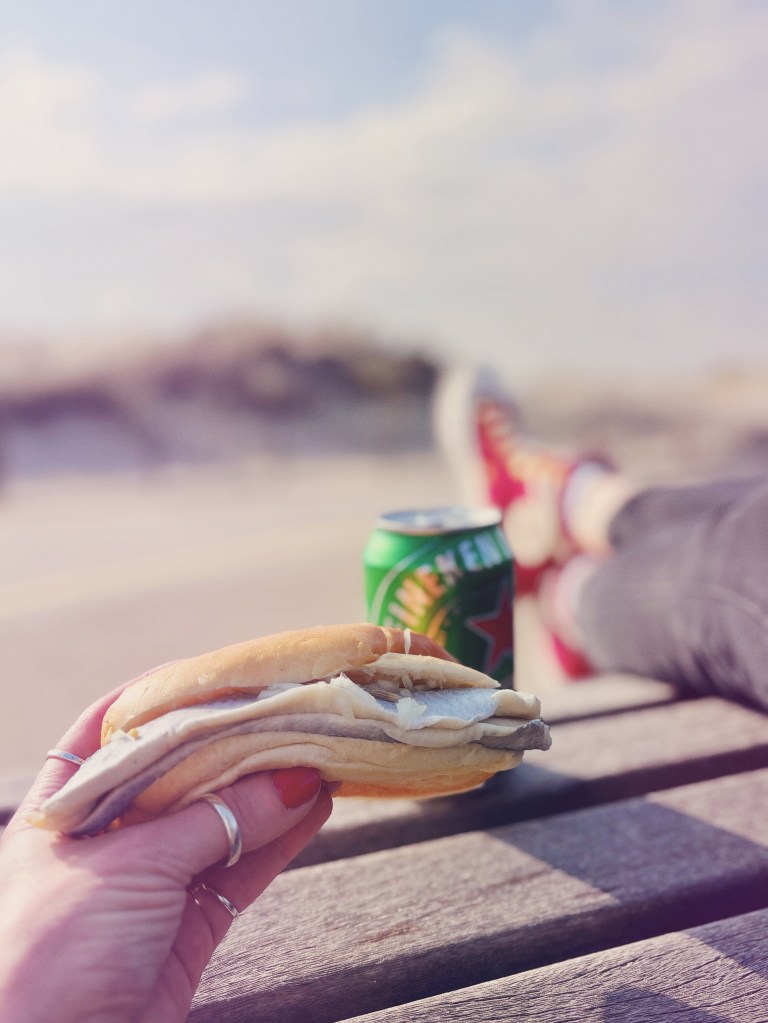 Ich bringe meine Klamotten aufs Zimmer, lasse mir auch hier nochmal einen Kaffee aus der Maschine, ziehe mich um und trolle mich in Richtung Strand. Erster Halt: Das absolut und indiskutabel obligatorische Heringsbrötchen samt Dosenbier beim alteingesessenen „Fishtruck“ am Deich. Ich muss leider gestehen: Ich habe eine absolut unüberwindbare Schwäche für jede Form vom Fisch- / Bismarck-/ Krabben- und Co.-Brötchen, die es mir wie immer unmöglich machen wird, mich die nächsten Tage nicht ununterbrochen mit diesen Dingern vollzustopfen. Ich habe irgendwie so etwas wie einen zweiten Magen dafür. Ich schleppe meine saftige Beute über die paar Stufen am Deich. Das Meeresrauschen begleitet mich schon seit meiner Ankunft, aber dieser eine kurze Moment, wenn der höchste Punkt des Deichs endlich den Blick freigibt auf das Meer und den Horizont: DAS ist es. Das wird für mich immer etwas ganz Besonderes bleiben – egal wie oft ich genau diesen Weg schon genau hier und genau so erlebt habe.