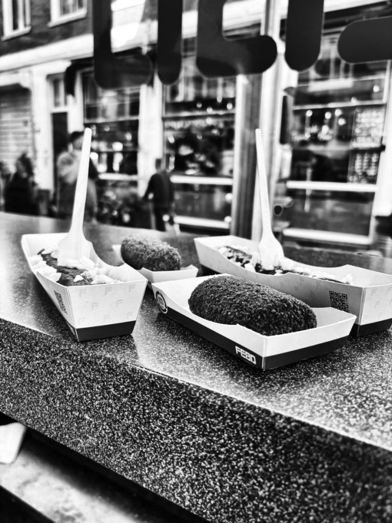 Auf dem Plan heute steht: Nichts – wenigstens tagsüber. Das kommt uns gerade sehr gelegen, da wir ohnehin schwer damit beschäftigt sind, die ganze Vintage-Läden des Viertels zu durchstöbern. Ich selbst hab ja so meine liebe Not mit dem Erwarb und der Nutzung von bereits getragener Kleidung – aber die Accessoires in diesen Läden finde auch ich mehr als interessant. So zieht der Tag an uns vorbei: Hier und da ein Laden, hier und da ein Cafe. Schlussendlich entscheiden wir uns, unsere Beute (bestehend aus Käse, ein paar Kleidungsstücken & Accessoires, sowie den Schmuckstücken vom Morgen) zurück ins Hotel zu schleppen und den Nachmittag auf der Hauseigenen Terrasse mit Vino & Aperol in der Sonne ausklingen zu lassen. Aber vorher müssen wir ja unbedingt noch die letzte aller Touristensünden begehen: Frikandel Spezial, Fleischkroketten und eine Bami Scheibe soll es sein. Fastfodd der allerfiesesten Sorte – aber, wir kommen nicht umhin zu gestehen: Leider geil!!