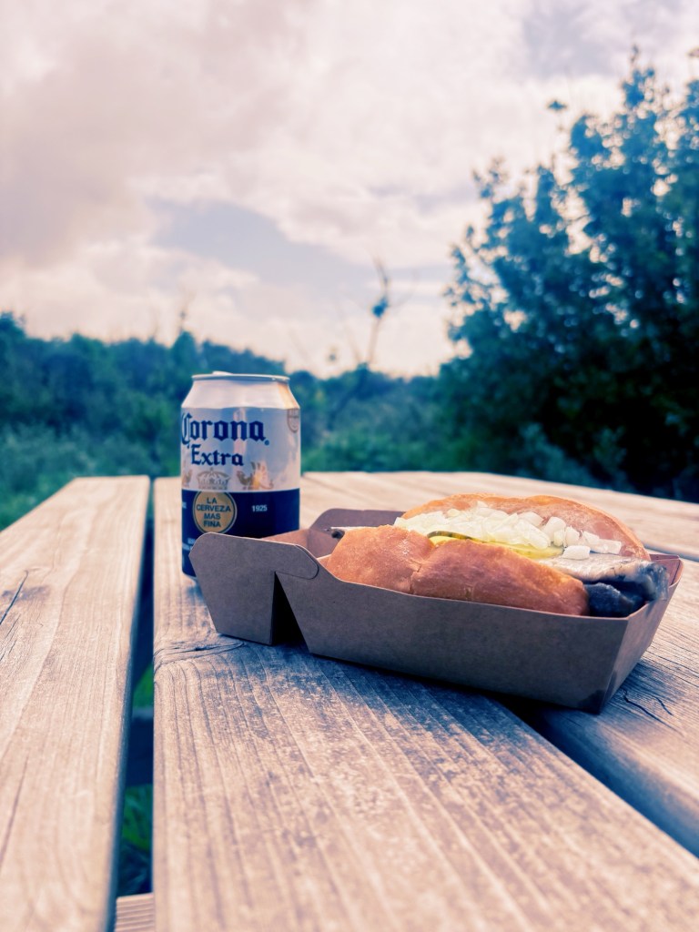 Ein ordentlich bassiges „Bwuuuut“ von einem der Containerschiffe im Hafen reißt mich aus meinen Gedanken. Gerade noch rechtzeitig, denn um ein Haar hätte ich die Einfahrt in die kleine, unscheinbare Seitenstraße entlang der Hafen-Docks verpasst, in der sich der letzte Stop vor Ankunft gut versteckt hält: Einer der unzähligen Fischhändler in den Docks. Mittagsimbiss für die Hafenarbeiter mit angeschlossenem Restaurant für andere Gäste. Überflüssig zu sagen, dass mein Stop dem Erwerb meiner persönlichen Nordseedroge gewidmet ist: 2 Heringsbrötchen mit Zwiebeln werden wenige Minuten später stolz zum Auto geschleppt.