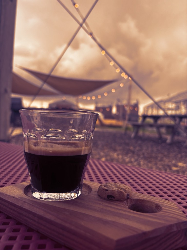 Bis die klebrige Masse eingetrocknet und abwaschbereit ist, setze ich mich auf einen Kaffee an die Tagesbar im Camp und versuche ein paar Zeilen zu schreiben (Das grandiose WE in Amsterdam wartet noch auf Veröffentlichung).