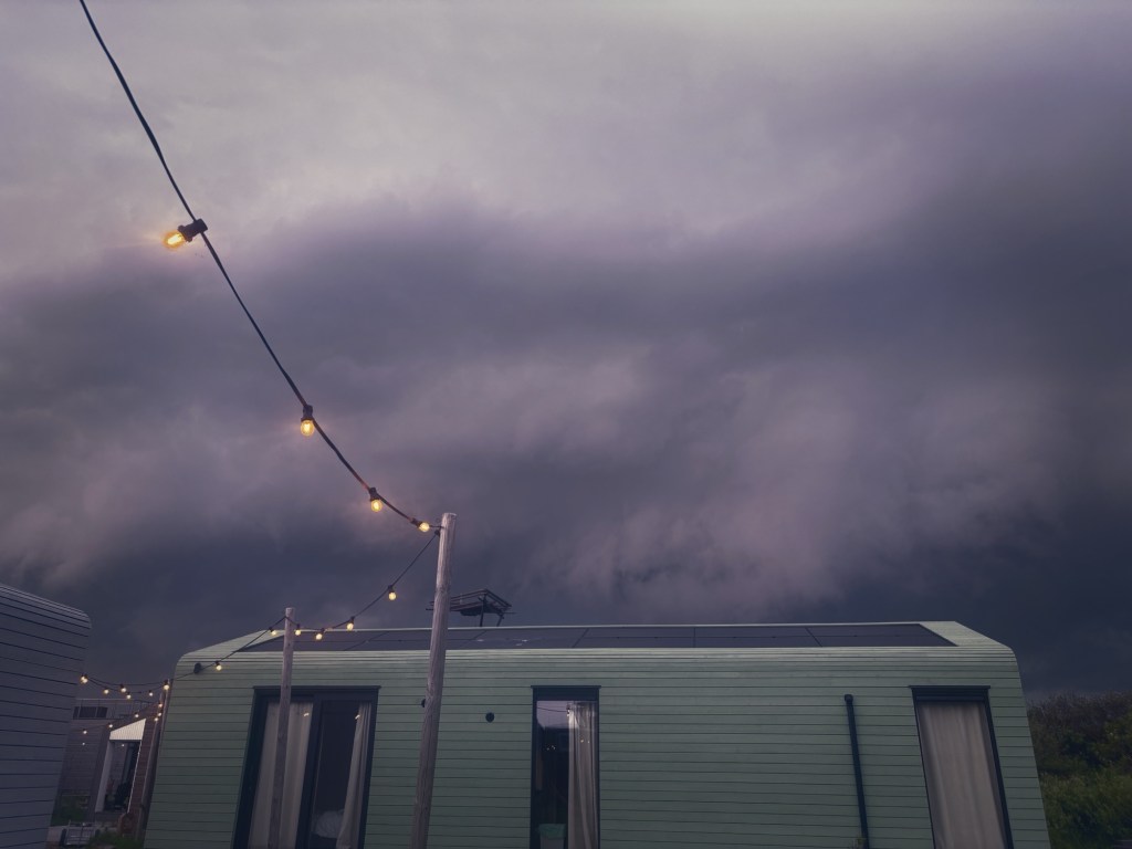 Schnell rein in die gute Stube! Keine Sekunde zu früh schließe ich – nicht ohne ein kurzes Gerangel mit dem Wind – das letzte Fenster. Das Einzige, was ich jetzt noch tun kann, ist zu hoffen, dass der zuständige Baumeister die kleine, nicht unterkellerte Bude mit ordentlichen Dübeln im Boden verankert hat. Aber ich vertraue irgendwie darauf, dass die hier oben wissen, wie man sowas macht – schließlich haben die ja sicher öfter mit derartigen Nordsee-Wetter-Kapriolen zu kämpfen.