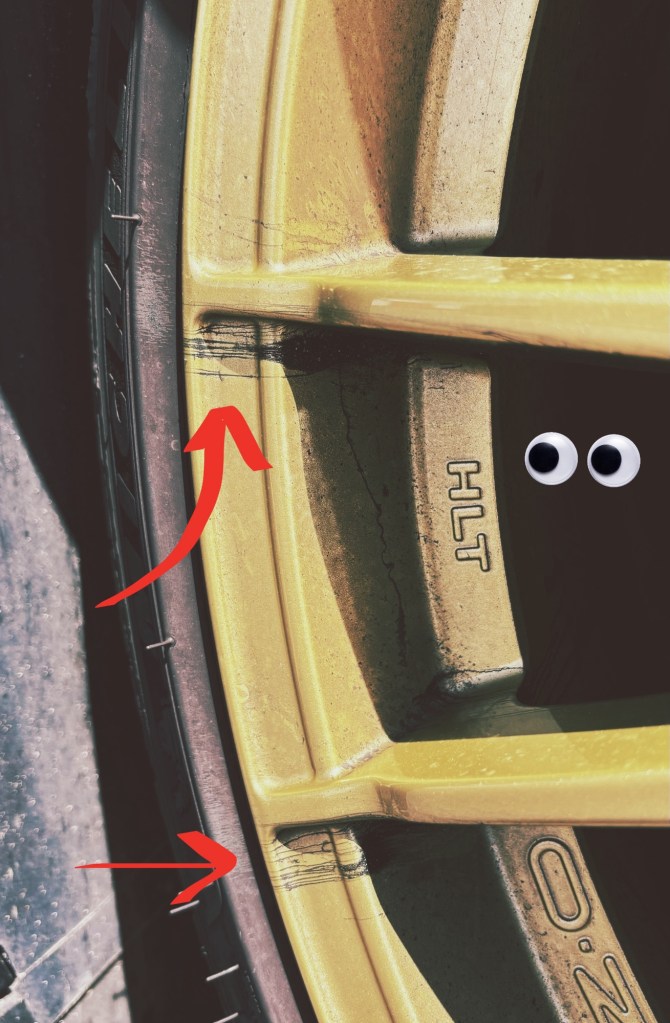 Auf dem frisch polierten Goldton meiner Felge ist ein Meer von dunklen Flecken zu sehen – manche mit Schlieren, wie von Regentropfen, die an einer Seitenscheibe langlaufen. Nur … gab es auf der Herfahrt keinen Regen. Nichtmal einen Tropfen. Wenn da also eine Sache nicht auf der Felge sein sollte, dann wäre das? Genau! Flüssigkeit.