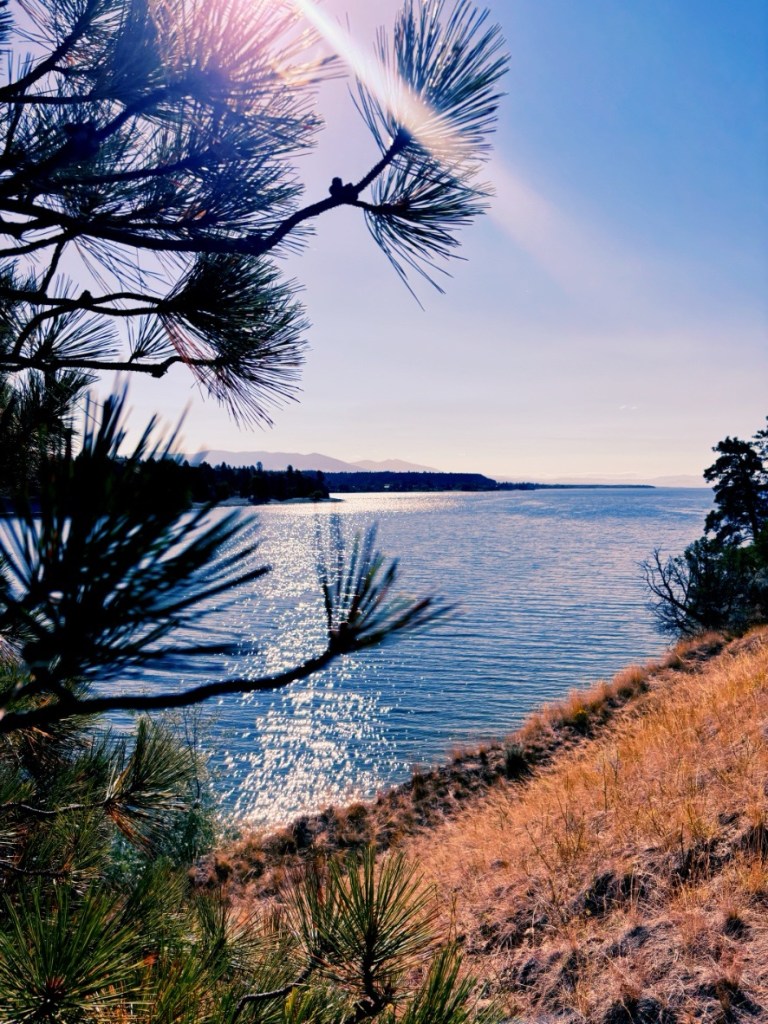 Schon nach weniger Meilen verlasse ich den Highway und biege ab um mit einem kleinen Umweg ein Bassin des Missouri River zu umrunden. Und damit beginnen sie – meine geliebten Backroads…! Und was soll ich sagen – kaum 5 Minuten später werde ich reichlich belohnt und muss den Truck schon das erste Mal in einer Staubwolke zum Stehen bringen. Die Aussicht auf den See in der Morgensonne ist einfach zu schön und ich mache ein paar Schritte am Ufer. Es gibt einen schönen Steinstrand – der von hier oben aber leider unerreichbar ist. Da hilft auch das Schotter-Erprobte Schuhwerk nicht.