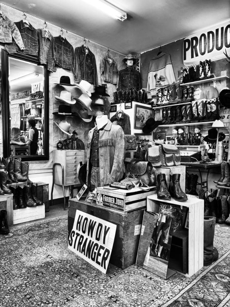 Der kleine Umweg hierher hat sich auf jeden Fall gelohnt. Der einfache Name „Bozeman Vintage“ lässt jetzt nicht unbedingt vermuten, was sich hinter der Tür verbirgt, jedoch habe ich den Laden online entdeckt (IG Algorithmus sei Dank) und habe also zumindest eine leise Ahnung, was mich erwartet. Oben im Verkaufsraum angekommen, gehen mir dennoch die Augen über. Hier gibt es alles – so lange man Ausrüstung für Cowboys sucht. Auf alten Holzregalen tummeln sich Hunderte Paar Boots, Jeans, Buckles, Lederwesten, Chaps und Cowboyhüte.