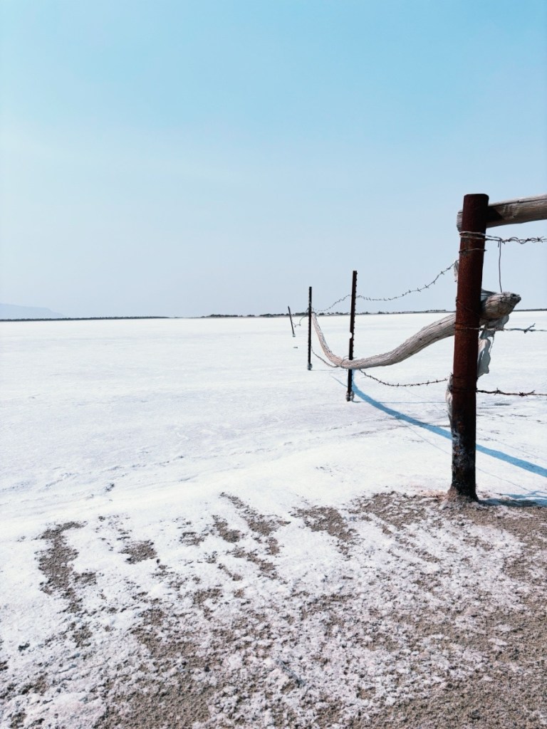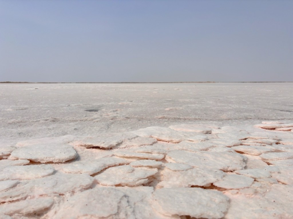 Das ist mit Abstand, das surrealste, was ich je erlebt habe!! Das fühlt sich an wie ein Traum. Von oben knallt die Sonne durch die Staubglocke. Das Licht ist diffus aber gleißend hell, wie auf einem Gletscher. Meine Füße stehen auf einer knirschenden weißen Kruste, die mein Oberstübchen aus seinem Erfahrungsschatz nur als „Eis“ identifizieren kann – aber es hat geschätze 35 Grad im nicht vorhandenen Schatten. Meine Hirnanhangdrüse schrubbt sich einen Wolf an der Frage, ob jetz nu Winter oder Sommer ist – weil erlebt wird gerade beides. Gleichzeitig.