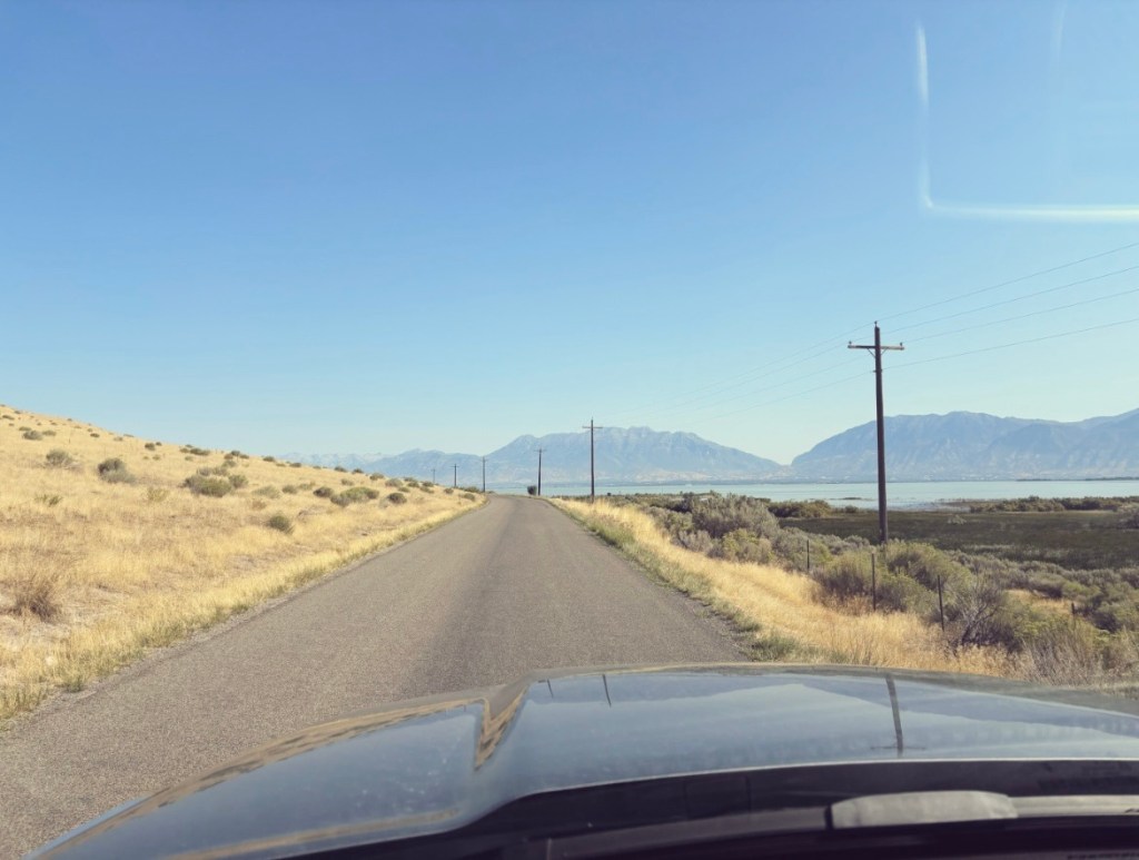 Das Navi piept mich wieder aus meinen Gedanken. Als erstes Zwischenziel habe ich „Stansbury Island“ eingegeben – eine kleine Halbinsel im See, noch ganz im Süden, also am Anfang. Die einzige Zufahrt erreicht man über eine kleine Straße, die quasi „durch“ den See verläuft. Und genau hier beginnt das zweifelsohne surrealste Stück Straße, das ich je mit einem Auto befahren habe.