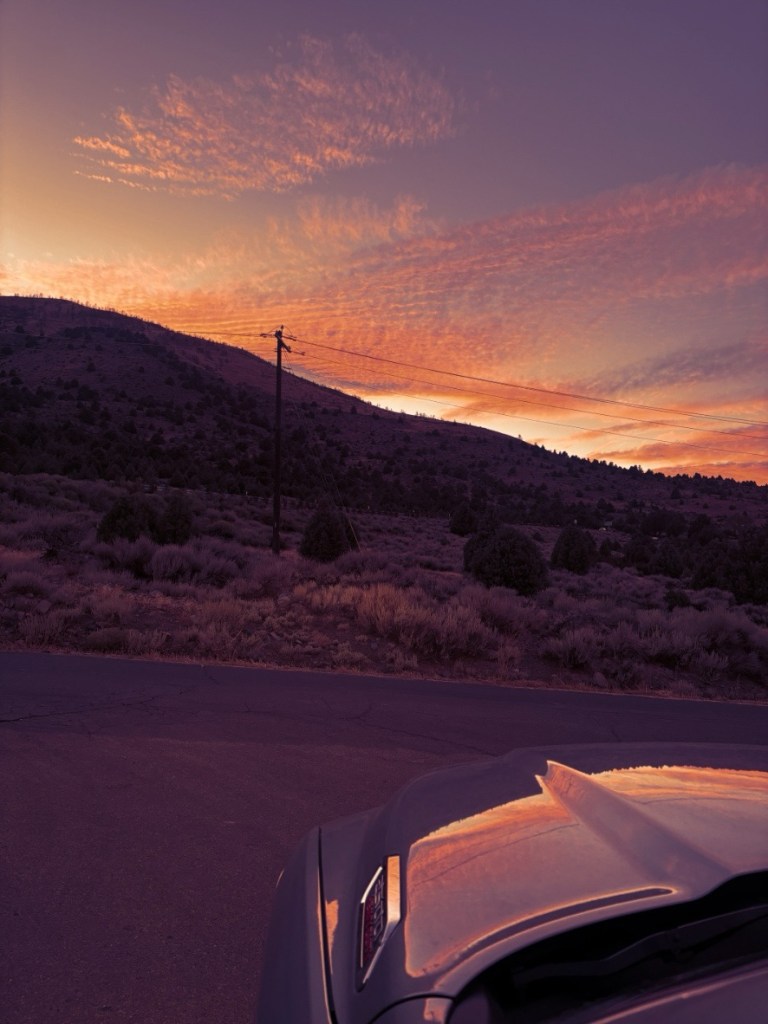 Aber dieses Vergnügen muss noch etwas warten, denn mir knurrt der Magen. Da auch dieser Ort hier nicht allzu groß ist, gibt es nur ein Restaurant. Im – Ich ahne es – Casino. Stimmt! Bin ja von Kalifornien wieder nach Nevada gefahren. Schon witzig, diese beiden Staaten nebeneinander. In dem einen ist Glücksspiel legal – in dem anderen Marihuana. Aber bitte nicht beides gleichzeitig. Ich gebe mich geschlagen. Dann ist heute eben Casino-Abend. Auf der kurzen Anfahrt bestaune ich noch eine abenteuerliche Himmelsfärbung. Scheint mir jemand Glück zu wünschen da oben. Ich hab auch schnell einen Verdacht, wer das sein könnte.