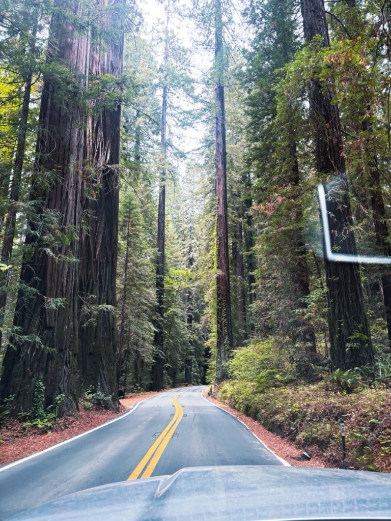 Schon witzig – Während ich die letzten Tage Mittags immer zu meinem Eiskaffee gegriffen habe, hoffe ich hier inständig, mein Kaffee im Thermobecher sei noch heiß, als ich nass und durchgefröstelt vom Pieseln komme (Ist er!) Zudem muss ich zum allerersten mal überhaupt die Heizung im Auto aufdrehen. Ich lasse den Leuchtturm hinter mir und mache mich auf in Richtung meines nächsten Ziels: Der Humboldt Redwood State Park wartet. Aber erstmal muss ich den ganzen, langen kurvigen Waldweg zur 101 wieder zurück.