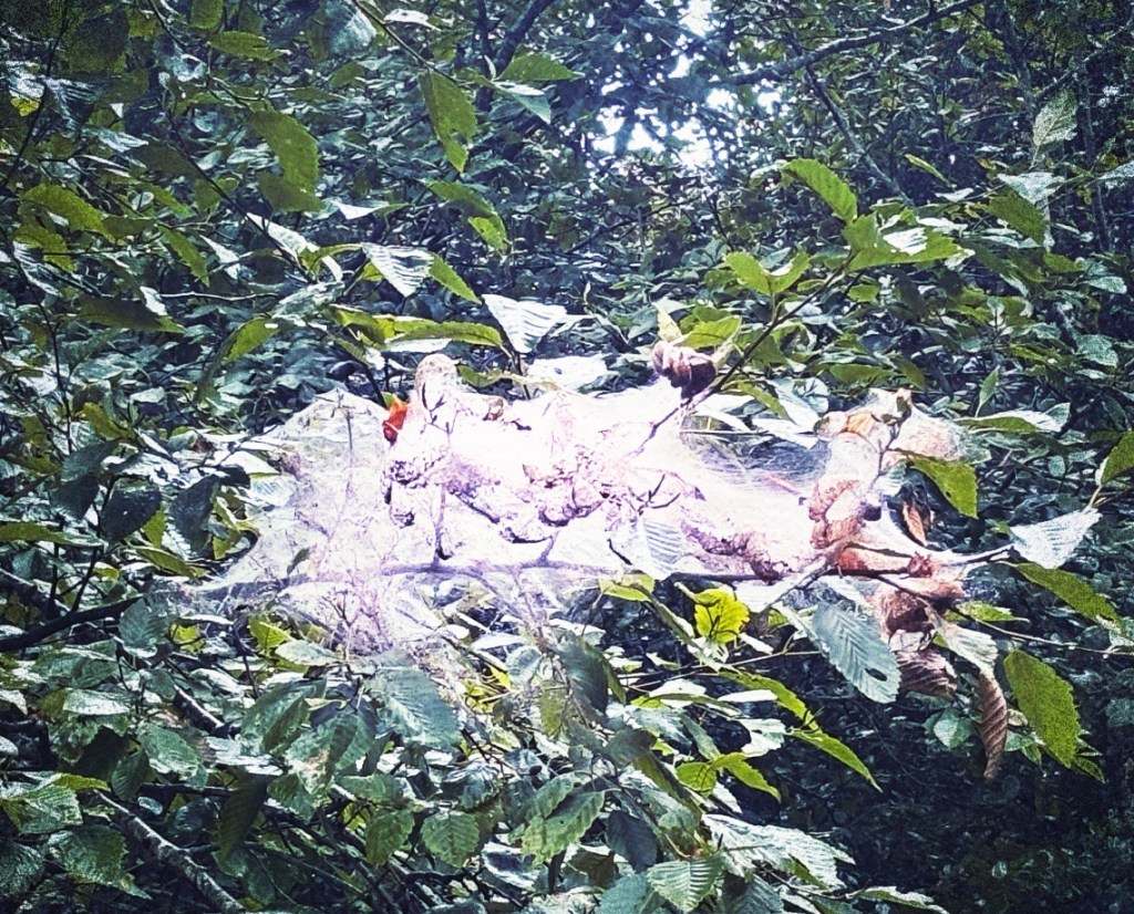 Da ich den aber jetzt schon kenne, habe ich Zeit, bei der Fahrt mal wieder meinen Blick rechts und links entlang des Weges streifen zu lassen. Als erstes fallen mir merkwürdige, weiße Gebilde auf, die zu Dutzenden in einer bestimmten Sorte Baum hängen. Sieht aus wie eine Art dichtes Spinnennetz, oder überdimensionale Kokons oder so. Ich halte an und beschaue mir das genauer. Ich habe jedoch auch bei näherem Hinsehen keine Ahnung, was das nun wieder für eine eklige Ausgeburt der Insekten-Hölle sein mag.