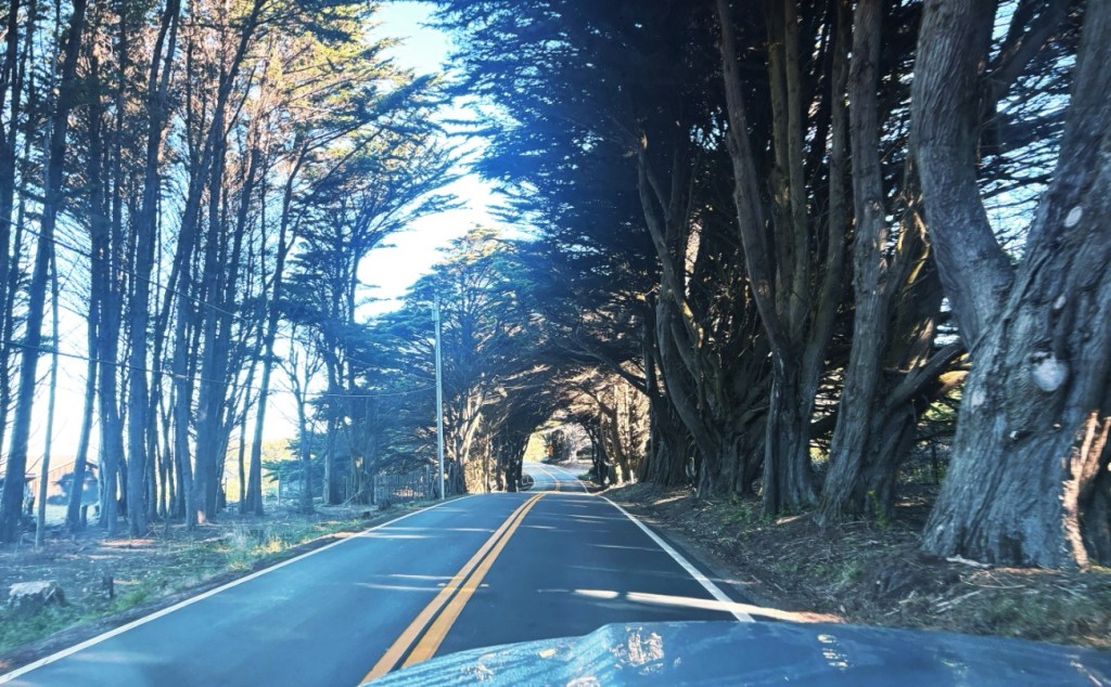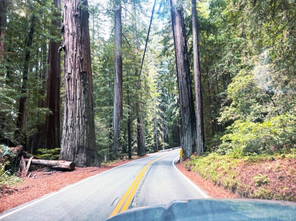 Die Fahr geht immer weiter in die Berge und immer dichter in den Wald. Langsam tauchen unverkennbar die ersten Redwoods im Gehölz auf. Zwar noch vergleichsweise klein – aber das ändert sich spürbar mit jedem Meter. An einer Abzweigung erspähe ich ein Schild mit einem Hinweis auf einen „Drive Through Tree“.