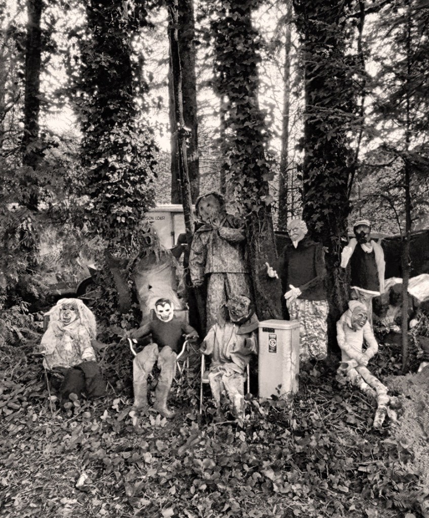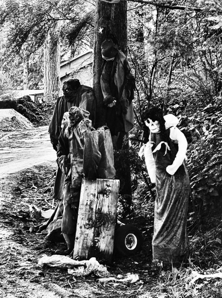 Daheim stehen schon die ersten Spekulatius in den Supermärkten – und hier zu Lande sind die Vorbereitungen auf Halloween in vollem Gange. Sämtliche Geschäfte sind vollgestopft mit Kinder-Kostümen, auf jeder freien Palette im Land stapeln sich Kürbisse in jeder Form und Größe, die Regale bei Walmart, Target & Co biegen sich unter 20-Liter Süßigkeiten-Säcken und die ersten Häuser sind mitunter reich bestückt mit einem lustig-gruseligen Potpourri. Den König der Halloween-Deko allerdings, den entdecke ich auf der 101. Der gute Manns scheint es sich zum Ziel gesetzt zu haben, seine Nachbarschaft mindestens bis Neujahr mit Alpträumen zu versorgen. Im Antlitz eines sonnigen Morgens mag das ja alles halb so wild sein – aber des Nächtens möchte ICH diese Einfahrt nicht hinaufgehen müssen.