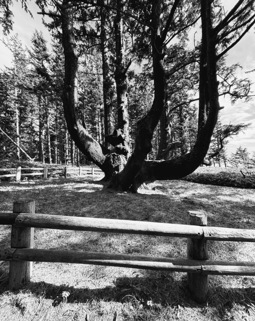 Aber nicht nur der Leuchtturm ist an diesem Stop ein kleines Must-See. Ein paar Schritte weiter kann man auch noch den „Octopus Tree“ bestaunen. Das Ding ist ein Moster. Ganz anders als die Redwoods – aber deswegen nicht weniger eindrucksvoll. Ein gigantischer Zusammenwuchs von mehreren, dicken Stämmen, die sich gebogen in den Himmel recken – jeder von ihnen mit etwa einem Meter Durchmesser.